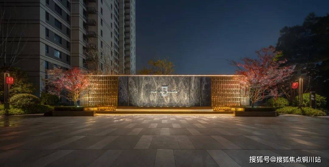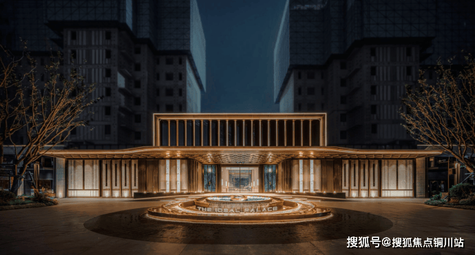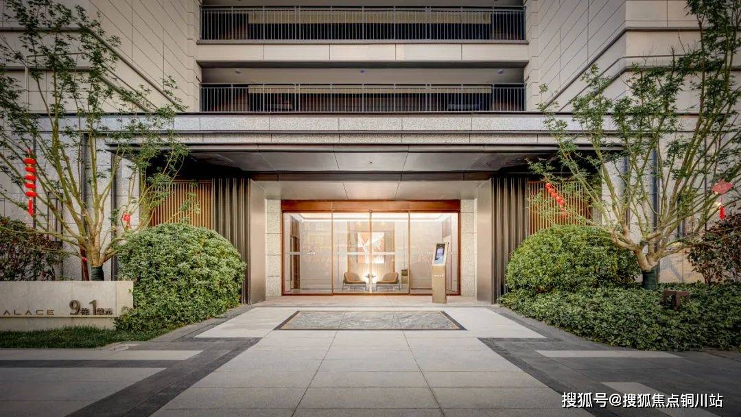大门整体是中式设计,高约6米,宽约30米,门廊进深约9米,门前有水系,两侧有宫灯,营造了一种具备东方意境的酒店式归家仪式感。
