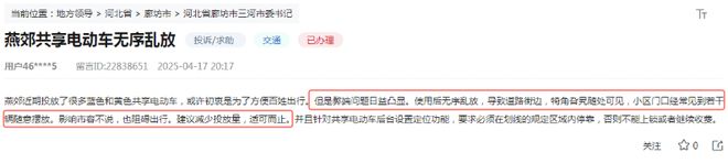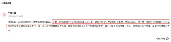 此前有网友留言反映,燕郊共享电动车无序乱放问题。近日官方最新回复, 目前,三河市邀请的共享电动自行车企业正处于试运行阶段。接下来,三河市将全力做好引入共享单车的各项前期测试准备工作,进一步加大现场督导核查力度,持续规范运营企业做好车辆运维管理,努力为群众营造便捷、绿色、高品质的出行环境。